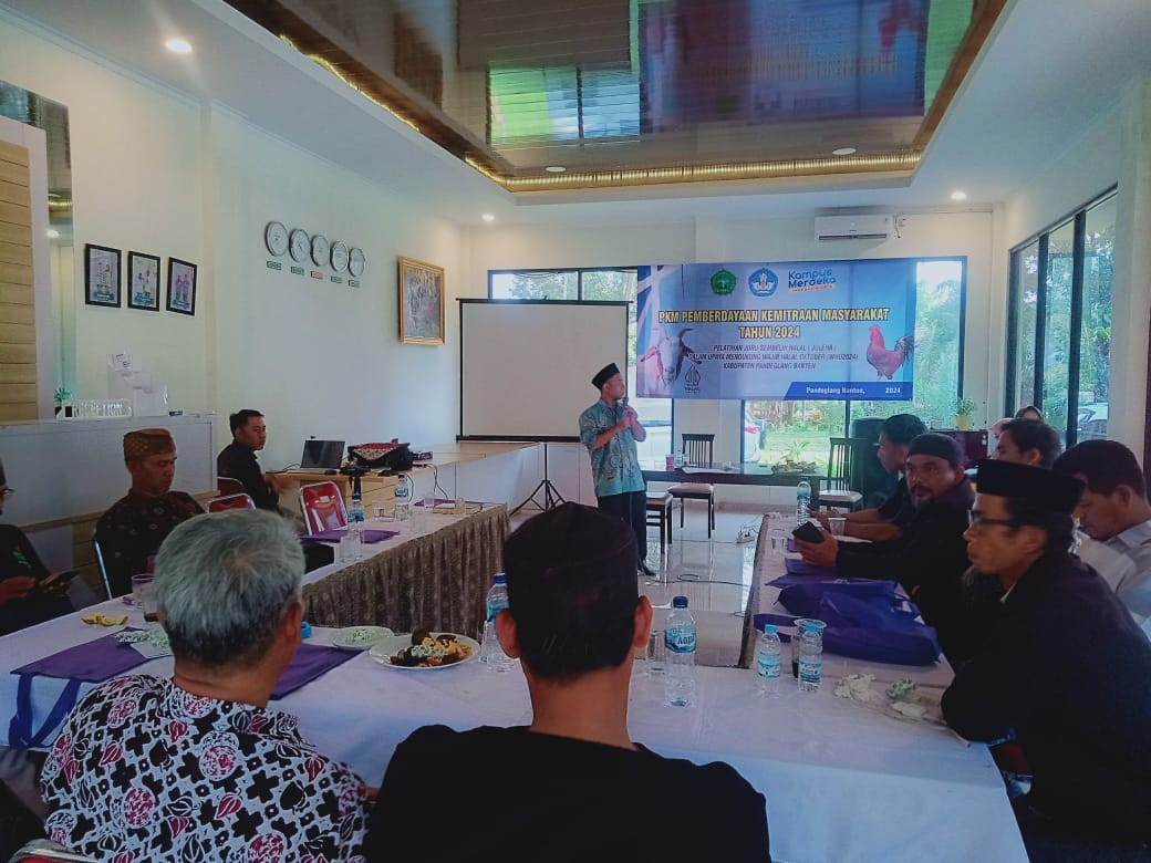 Hadi Susilo, sebagai ketua Tim Peneliti dalam Program Pemberdayaan Kemitraan Masyarakat (PKM), menjelaskan bahwa tujuan dari pelatihan juru sembelih halal ini adalah untuk menyiapkan sumber daya manusia terlatih, terutama juru sembelih halal yang memiliki standar SKKNI, dalam mendukung wajib halal pada bulan Oktober 2024 di Kabupaten Pandeglang.