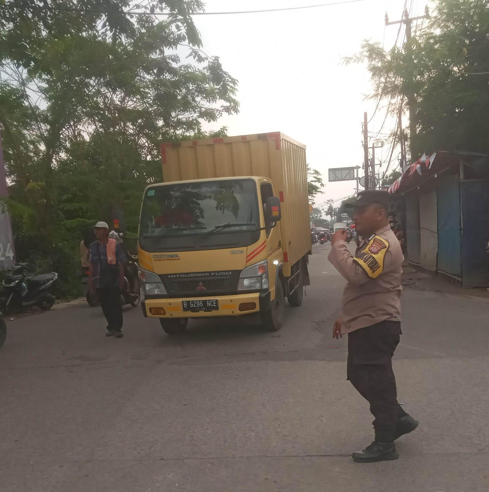 TIGARAKSA – Anggota Bhabinkamtibmas Polsek Tigaraksa Polresta Tangerang Polda Banten Bripka irvan melakukan pengaturan arus lalu lintas pada sore hari di pertigaan Polsek Tigaraksa.
