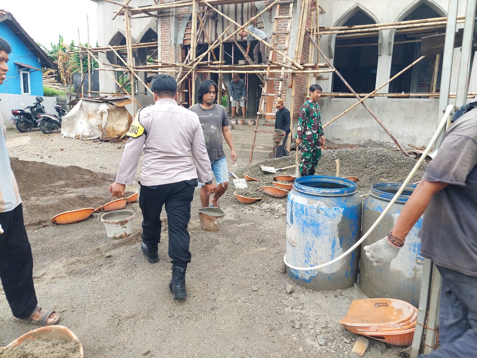 Bhabinkamtibmas Kelurahan Warnasari BRIPKA M. Enday bergotong royong bersama Para Santri Ponpes Mursyidul Falah dalam melaksanakan pembangunan Masjid Lingkungan Masyarakat Binaan, terlihat antusiasme Warga Masyarakat yang dengan penuh semangat dan keikhlasan dalam proses Pembangunan Masjid Tersebut dengan alat sederhana yang digunakan tidak menghalangi semangat mereka untuk melaksanakan pembangunan Masjid, selain sebagai bentuk kepedulian, apa yang Bhabinkamtibmas lakukan tidak lepas dari upaya untuk memakmurkan Masjid di wilayah tugasnya.