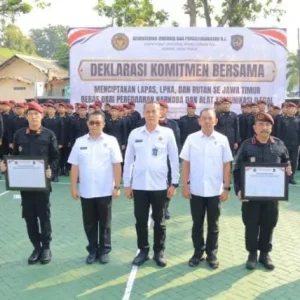 SIDOARJO, liputan7aktual.com — Kantor Wilayah Direktorat Jenderal Pemasyarakatan (Ditjen PAS) Jawa Timur menyatakan komitmen penuh untuk menciptakan Lapas dan Rutan yang bersih dari peredaran narkoba dan penggunaan telepon genggam ilegal. Komitmen tersebut dituangkan dalam kegiatan Deklarasi Komitmen Bersama, yang digelar Rabu (21/5) di Markas Kanwil Ditjenpas Jawa Timur.