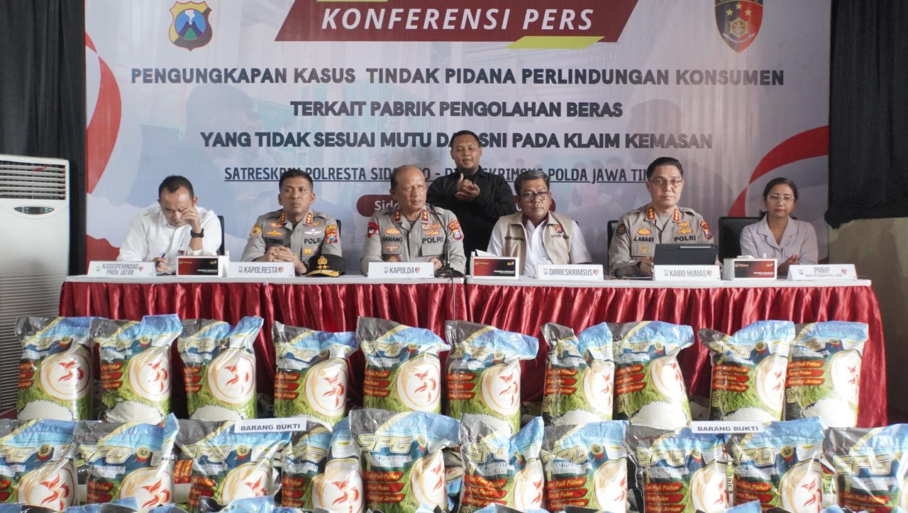 SIDOARJO – Polda Jawa Timur melalui Satgas pangan Polresta Sidoarjo berhasil mengungkap praktik produksi beras premium tidak sesuai standar mutu yang mencantumkan label SNI dan Halal secara tidak sah.