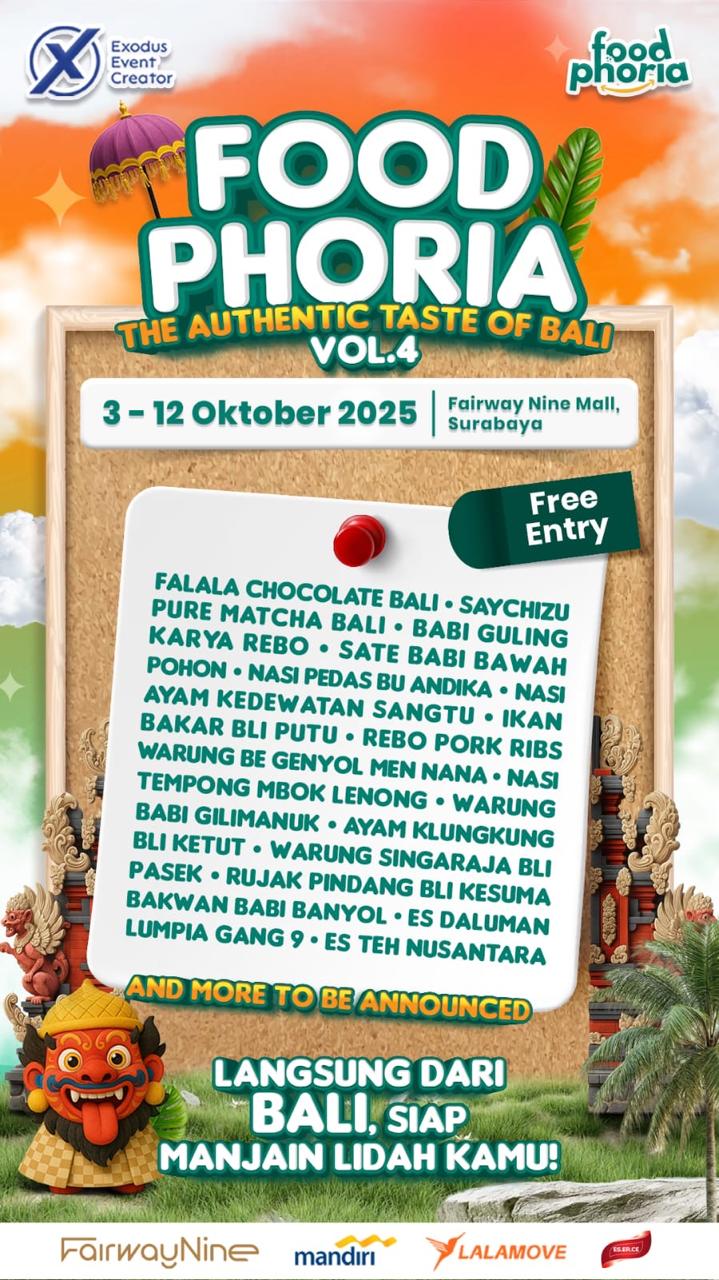 Telah hadir di tengah masyarakat Surabaya,event Mega Kuliner ala Bali bernama Food Foria dengan mengangkat tema “The Authentic Taste of Bali Volume 4” di Fairway Ninemall Pakuwon Surabaya mulai tanggal 03 – 12 Oktober 2025.