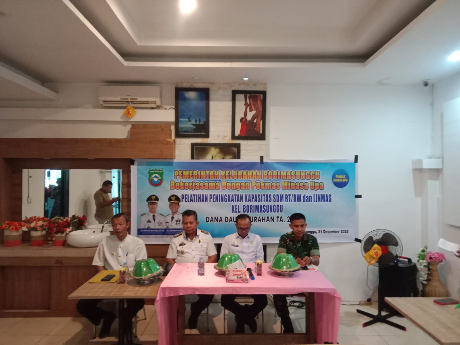 Pangkep liputan7aktual.com – Pemerintah Kelurahan Borimasunggu Bekerja Sama Dengan Pokmas Minasa Upa, mengadakan Pelatihan Peningkatan Kapasitas SDM RT/RW Dan LINMAS DANA DAU T.A. 2025 Kelurahan Borimasunggu, bertempat Di Cafe Logos Kelurahan Padoang-Padoangan Kecamatan Pangkajene Kabupaten Pangkep, Rabu, 31 Desember 2025.