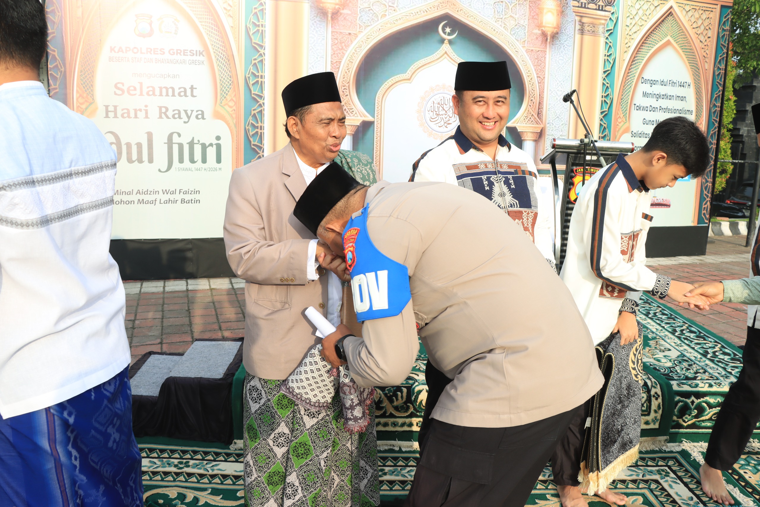 “Kami segenap keluarga besar Polres Gresik mengucapkan Selamat Hari Raya Idulfitri 1 Syawal 1447 H. Mohon maaf lahir dan batin atas segala kekurangan. Semoga seluruh amalan kita diterima dan kita mampu meraih kemenangan yang hakiki,” ungkapnya.