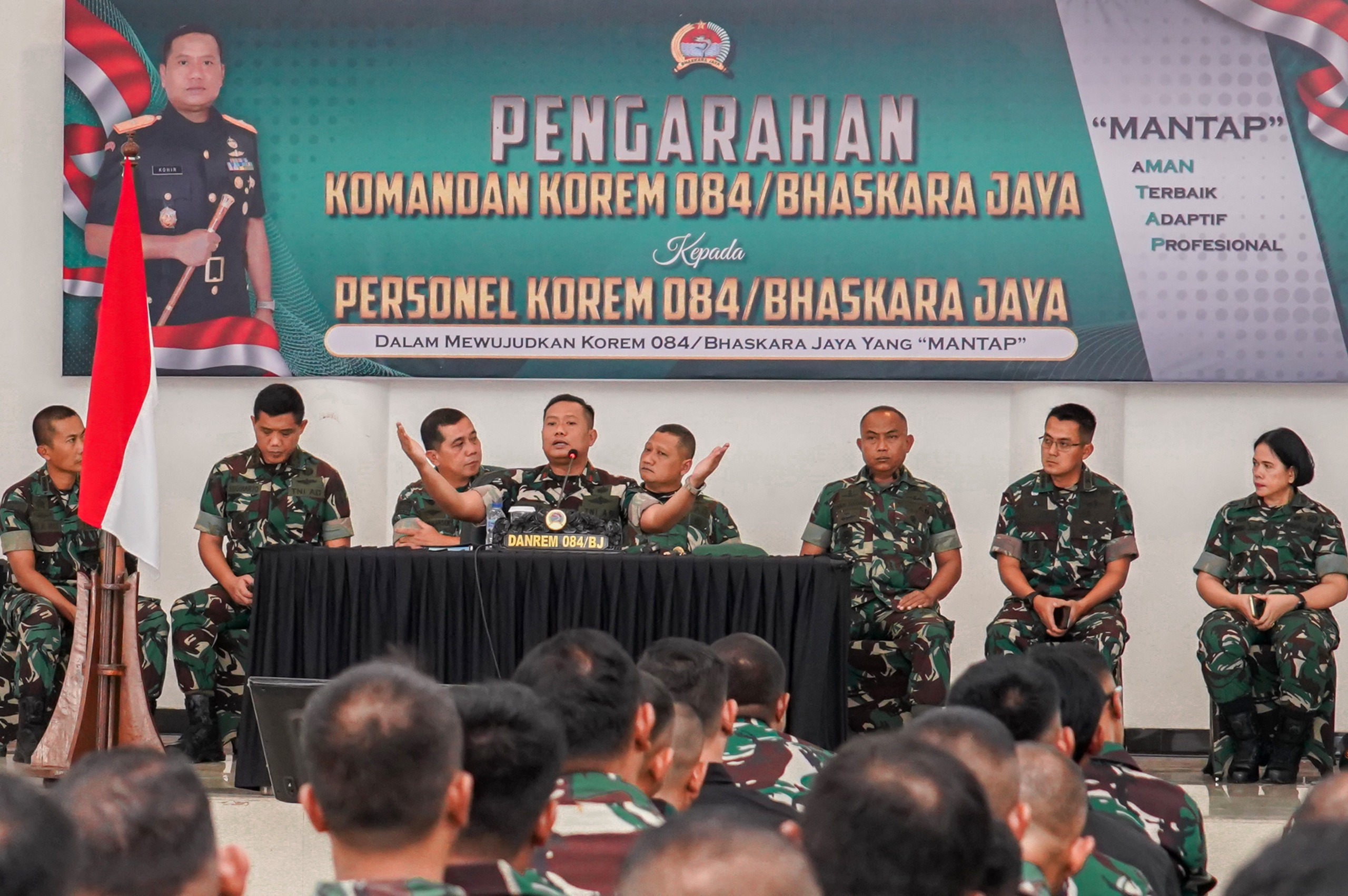 Surabaya – Komandan Resor Militer (Danrem) 084/Bhaskara Jaya, Brigjen TNI Kohir, memberikan pengarahan kepada seluruh personel di Aula Makorem 084/BJ, Surabaya, Senin (23/04/2026).